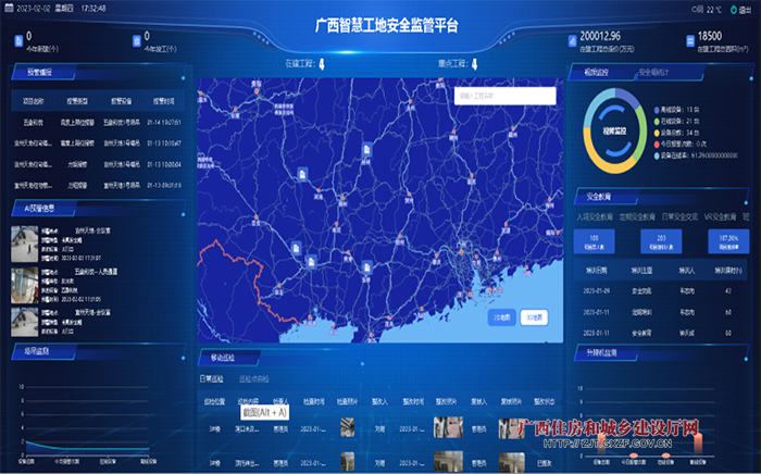 据介绍,目前智慧安全监管平台已完成2.0版本开发,具备完善的数据看板,可通过大数据+整改闭环,协助监管单位及参建单位对隐患的监督、发生、整改进行全流程监控。“智慧安全监管平台”与广西建设工程质量安全监督信息管理系统、广西建筑农民工实名制管理公共服务平台等系统平台打通后,已实现施工全程通数据、精准识别查违章、起重机械全监控、移动巡查除隐患、分类管控等全流程监管。例如,在施工监管方面,可对未按照管理要求进行履职的管理人员进行预警通报,确保施工现场管理人员履职到位;在起重机械全监控方面,可通过对塔式起重机、施工升降机进行运行状况实时监控,对超重、超载、超高、超速等违章操作进行实时监控;在移动巡查除隐患方面,安全巡查人员可通过手机记录检查过程并进行检查结果留存,确保日常巡查到位,落实安全防护隐患排查和整治,实现随时随地排险除患等。
